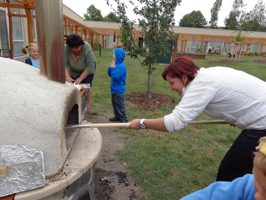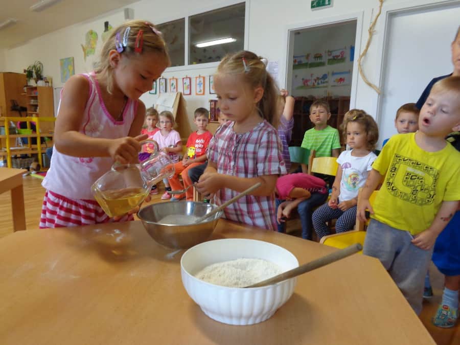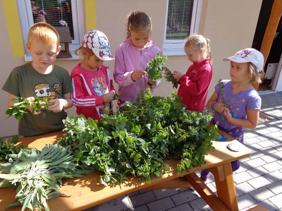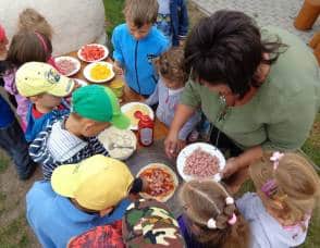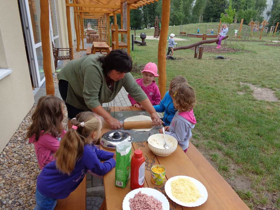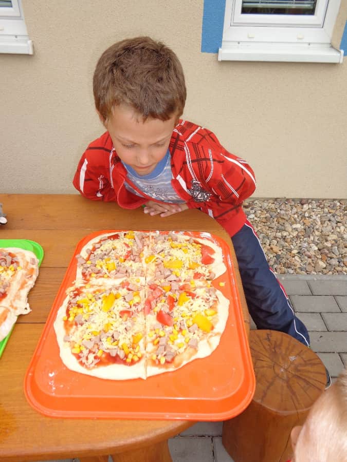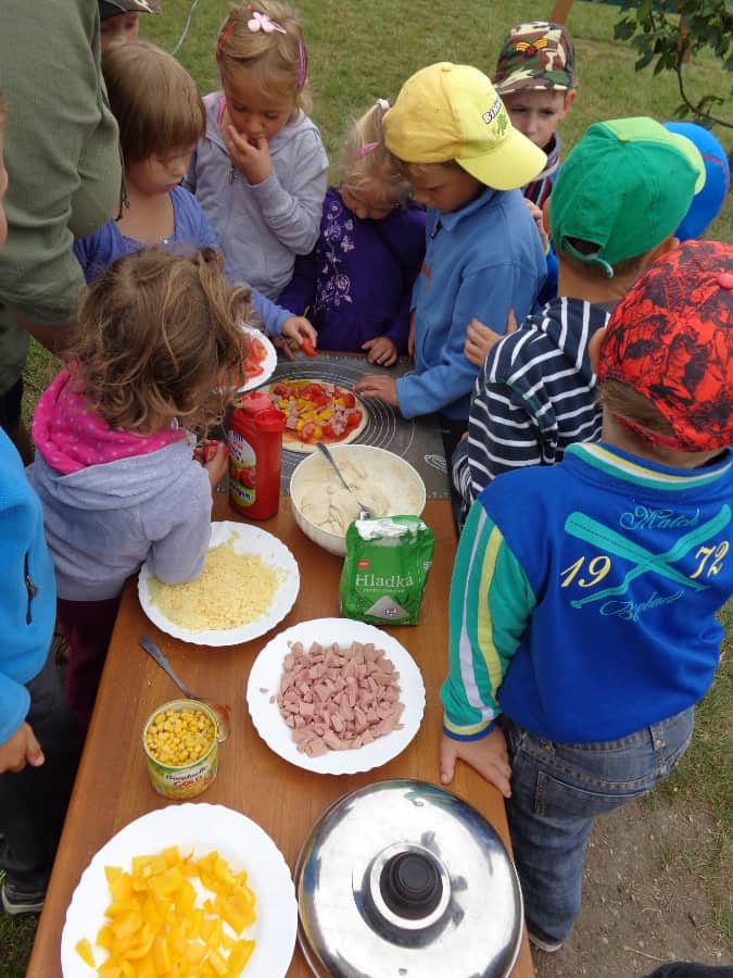 V loňském školním roce jsme měli otevřeno i o prázdninách v srpnu…děti si prázdniny užívaly i přes to, že chodily do školky. Co nejvíce času jsme trávili venku. Když nebylo hezké počasí, děti zkoušely péci v naší nové peci pizzu, na které si všichni moc pochutnali. Při pěkném počasí se děti koupaly, ale také sbíraly bylinky, ze kterých společně vařily bylinkový meduňkovo-mátový sirup …