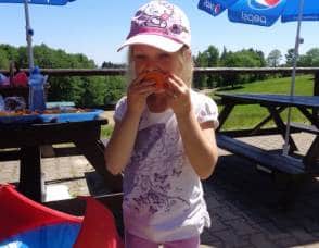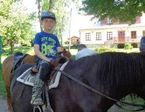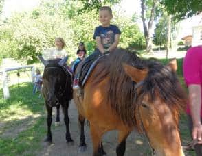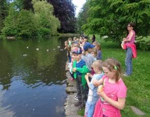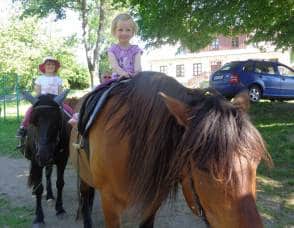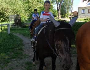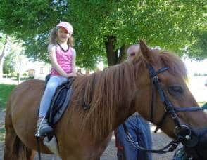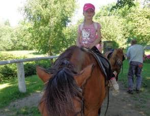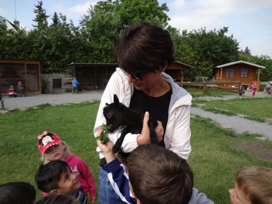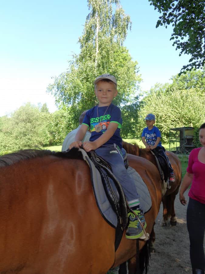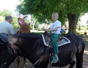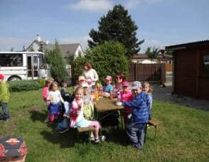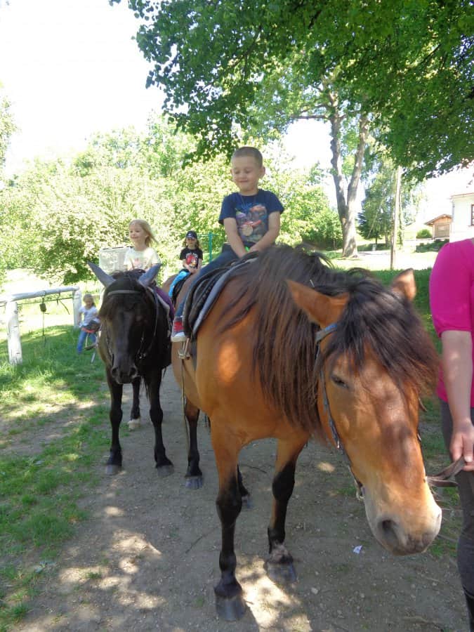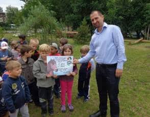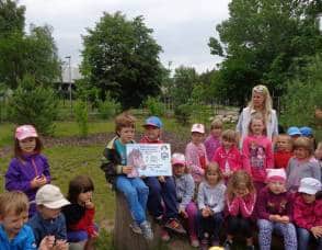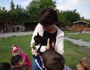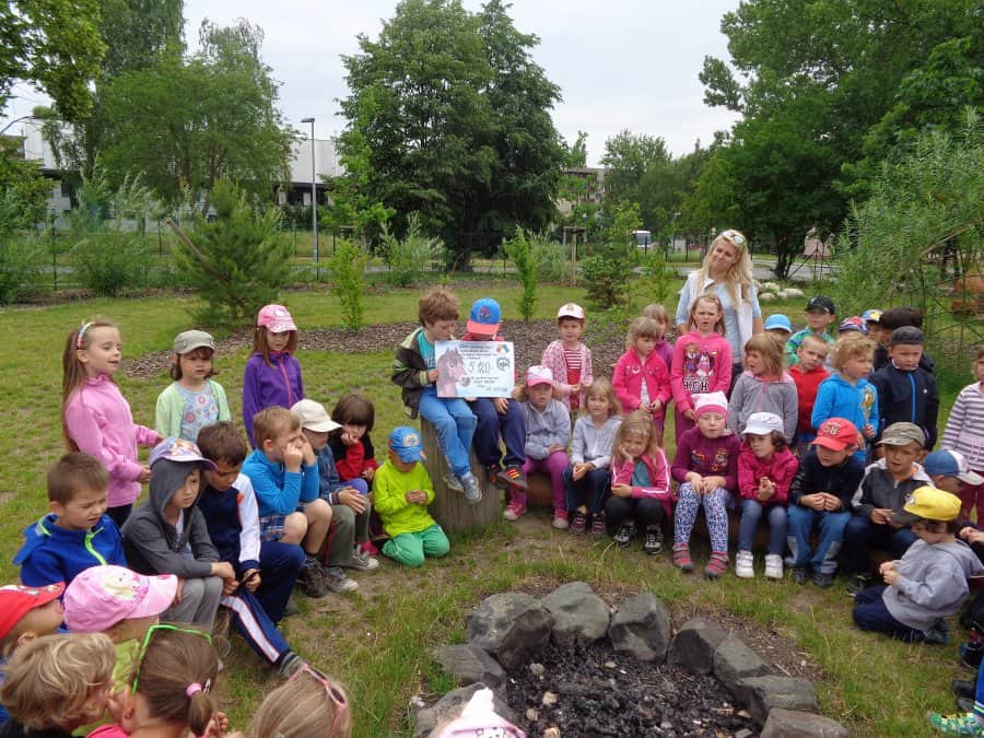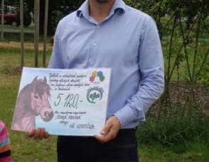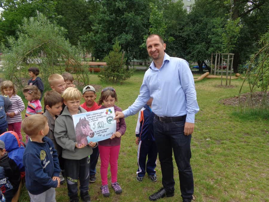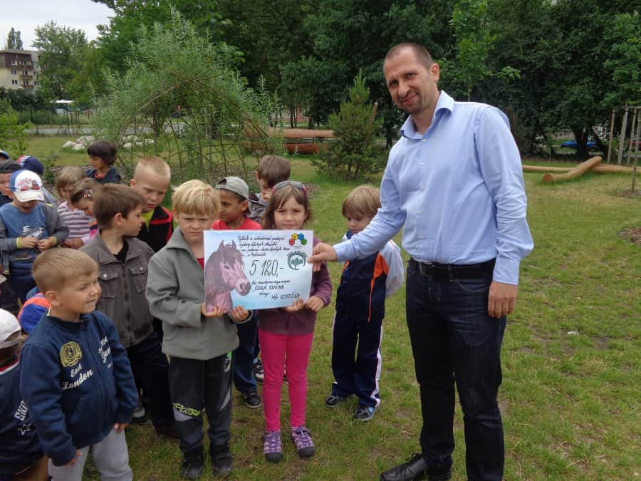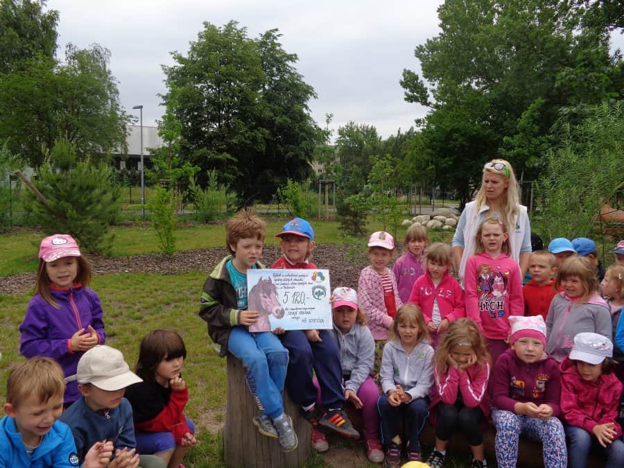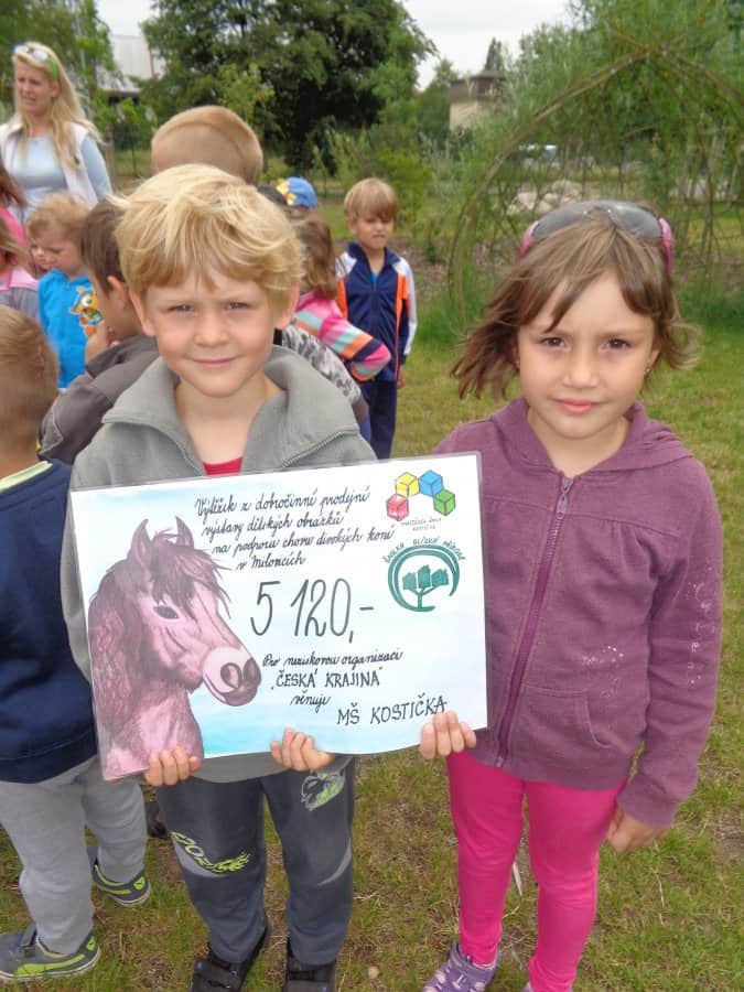 Poté, co jsme vybrali od rodičů příspěvky na podporu milovických divokých koní, které jsme získali za prodej dětských výkresů s koňskými náměty, jsme museli vyrobit reprezentativní šek. Když k nám přijel pan Dostál, zástupce společnosti, děti mu zazpívaly a na zahradě jsme společně předali šek na 5 120 Kč….