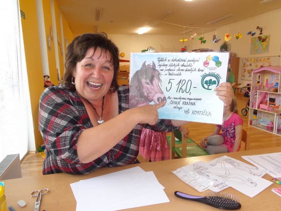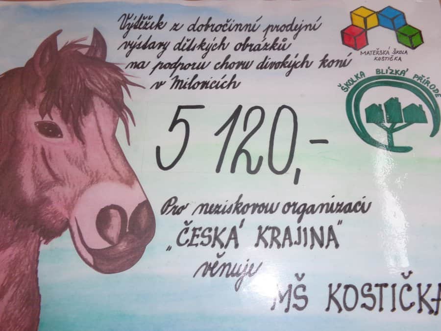 Náš prvotní pokus podpořit neziskovou organizaci „Česká krajina“ v chovu divokých koní v Milovicích se vydařil. Po prvotních obavách se k našemu úsilí připojily i ZŠ Juventa, MŠ U Broučků, Milischool a také ZŠ v Benátkách. Děti z Kostičky a z uvedených škol přispěly svými obrázky na dobročinnou prodejní výstavu, která se konala společně s Jarním zpíváním ve školce 5.května 2015.